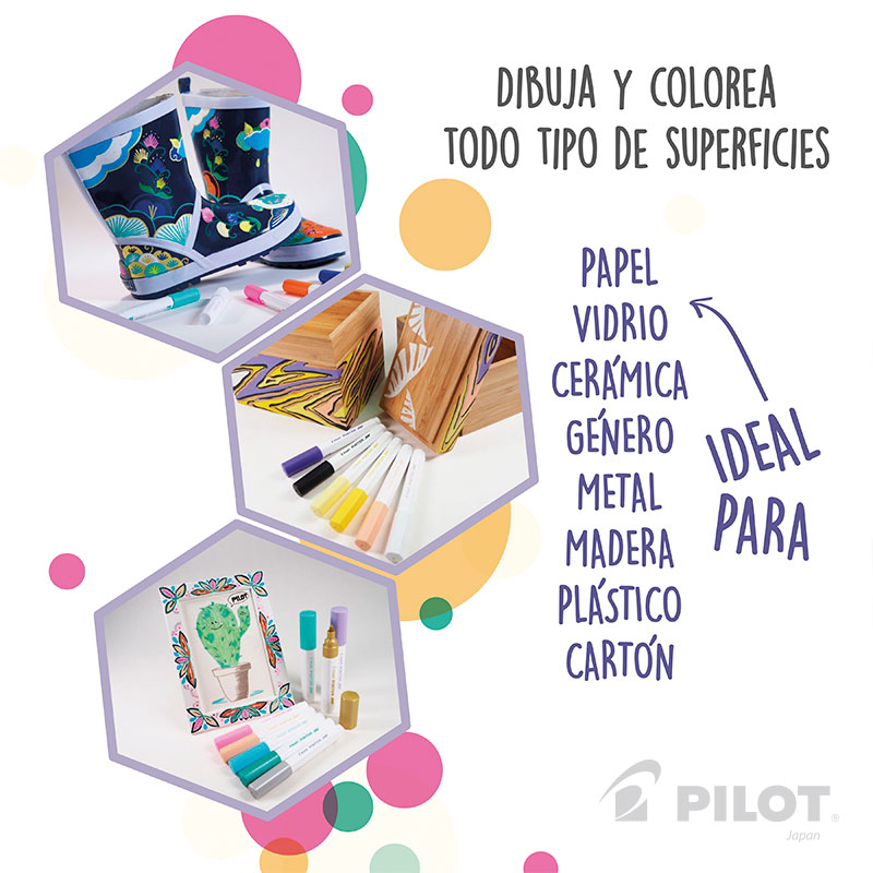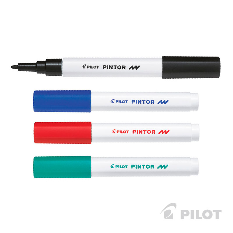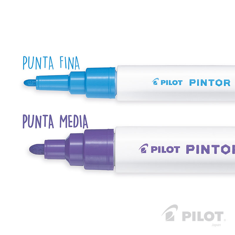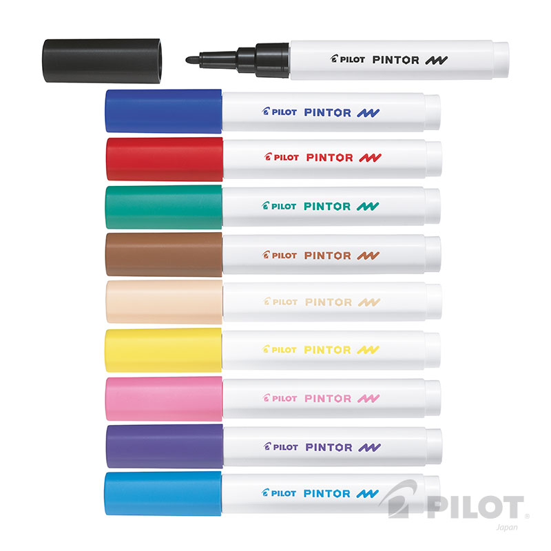 Ccon ellos podremos echar a volar nuestra imaginación y llenar de colores todo tipo de materiales, esto gracias a su nueva tinta pigmentada a base de agua, la que permite a los marcadores PINTOR de PILOT dibujar y pintar en todo tipo de superficies e incluso superficies oscuras de materiales como papel, plástico, vidrio, cerámica, cartón, metal, género, madera, cuero, cemento, piedra, etc.